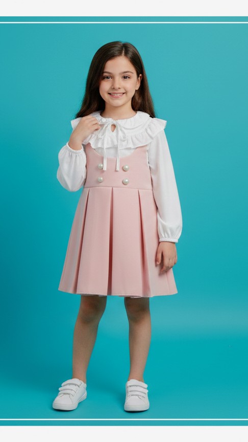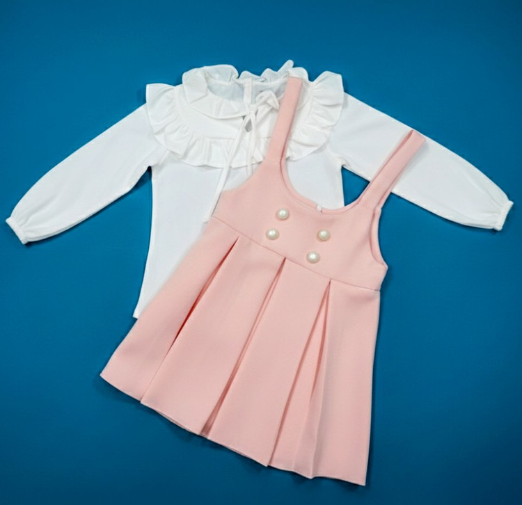 این ست دخترانه شامل سارافون صورتی ملایم با طراحی کلاسیک و شومیز سفید یقه چیندار هست که بهراحتی هم برای مهمونی مناسبه هم استفاده روزمره.